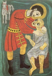 “Kijken met je hart”, staat er als thema op uw liturgieboekje. Op de afbeelding zien we Sint Franciscus de melaatse omarmen. We zien de liefdevolle blik van de beide mannen. Het is 1205; Franciscus rijdt op zijn paard in de buurt van Assisi. Hij weet niet goed wat hij met zijn leven aan moet. Dan ziet hij een melaatse lopen. Normaal zou hij hard wegrijden, maar nu stapt hij van zijn paard. Hij gaat naar de melaatse en omhelst hem. Het maakt hem erg gelukkig. Franciscus is er erg van onder de indruk. Vanaf dat moment kiest hij altijd partij voor de zwakkeren en de verdrukten. Franciscus heeft leren kijken met zijn hart.