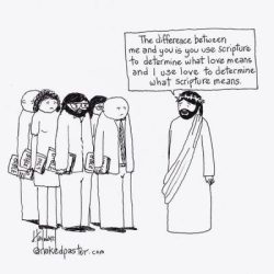 Afgelopen vrijdag zag ik op Facebook een cartoon die mij aansprak. Het is een afbeelding van een groepje mensen die allemaal een Bijbel in hun hand hebben. Tegenover hen staat Jezus. Jezus zegt tegen hen: “Het verschil tussen mij en jullie is dat jullie de Bijbel gebruiken om te bepalen wat liefde betekent, terwijl ik de liefde gebruik om te bepalen wat de Bijbel betekent.” Zo’n cartoon kun je natuurlijk op allerlei manieren interpreteren. Een mogelijke interpretatie die bij mij opkwam, is dat het niet gaat om de letter om de geest van de wet.